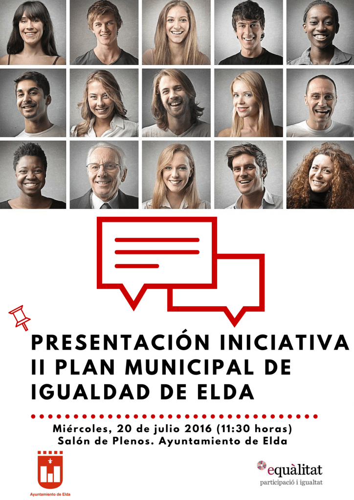 IDEAS FUERZA El próximo miércoles, 20 de julio se va a presentar la INICIATIVA del II Plan Municipal de Igualdad de Mujeres y Hombres de Elda 2017-2021. Los encargados de coordinar el proyecto público de igualdad serán EQUÀLITAT, participació i igualtat, la primera consultoría en materia de igualdad y participación ciudadana de la Comunitat Valenciana. El acto de la presentación