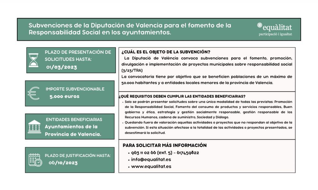 CONVOCATORIA PARA LA CONCESIÓN DE SUBVENCIONES DESTINADAS A LOS MUNICIPIOS DE POBLACIÓN HASTA 50.000 HABITANTES Y ENTIDADES LOCALES MENORES DE LA PROVINCIA DE VALENCIA PARA EL FOMENTO, PROMOCIÓN Y DIVULGACIÓN DE LA RESPONSABILIDAD SOCIAL. La Diputació de València convoca subvenciones para el fomento, promoción, divulgación e implementación de proyectos municipales sobre responsabilidad social (3/23/TRA) La convocatoria tiene por objetivo que