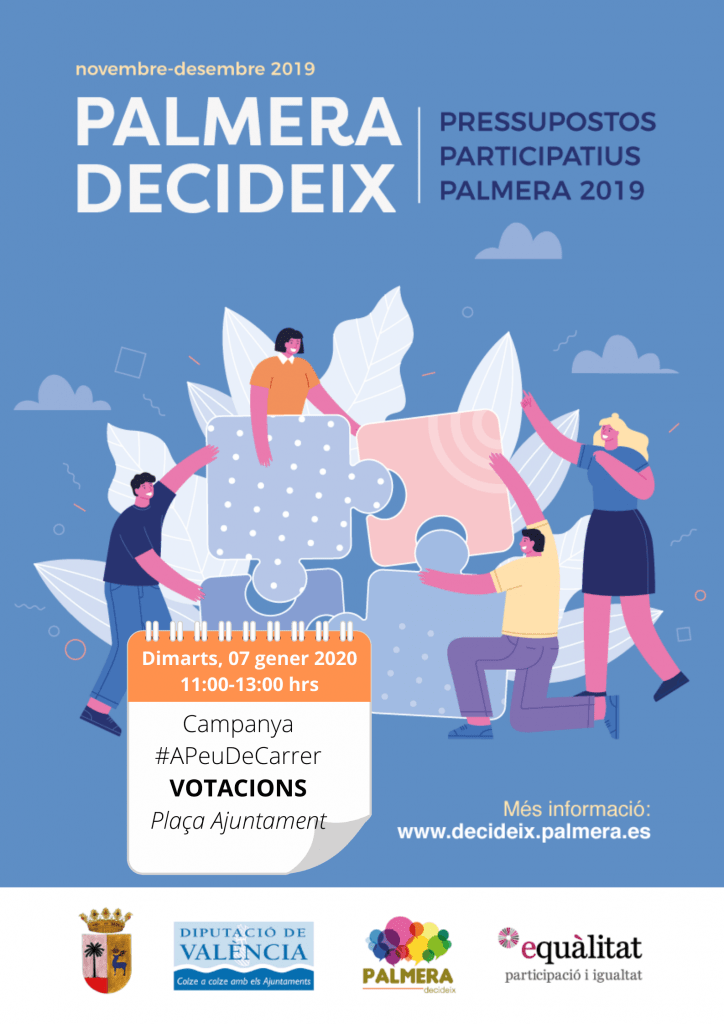 El proper 7 de gener EQUÀLITAT, participació i igualtat ens desplaçarem a la Plaça de l’Ajuntament de Palmera per promoure i facilitar la votació de les propostes plantejades des de les 11 del matí fins a la 1 del migdia. L’objectiu d’aquesta visita és dinamitzar les votacions, superar l’escletxa digital i garantir l’accessibilitat i participació de tota la ciutadania per igual.
