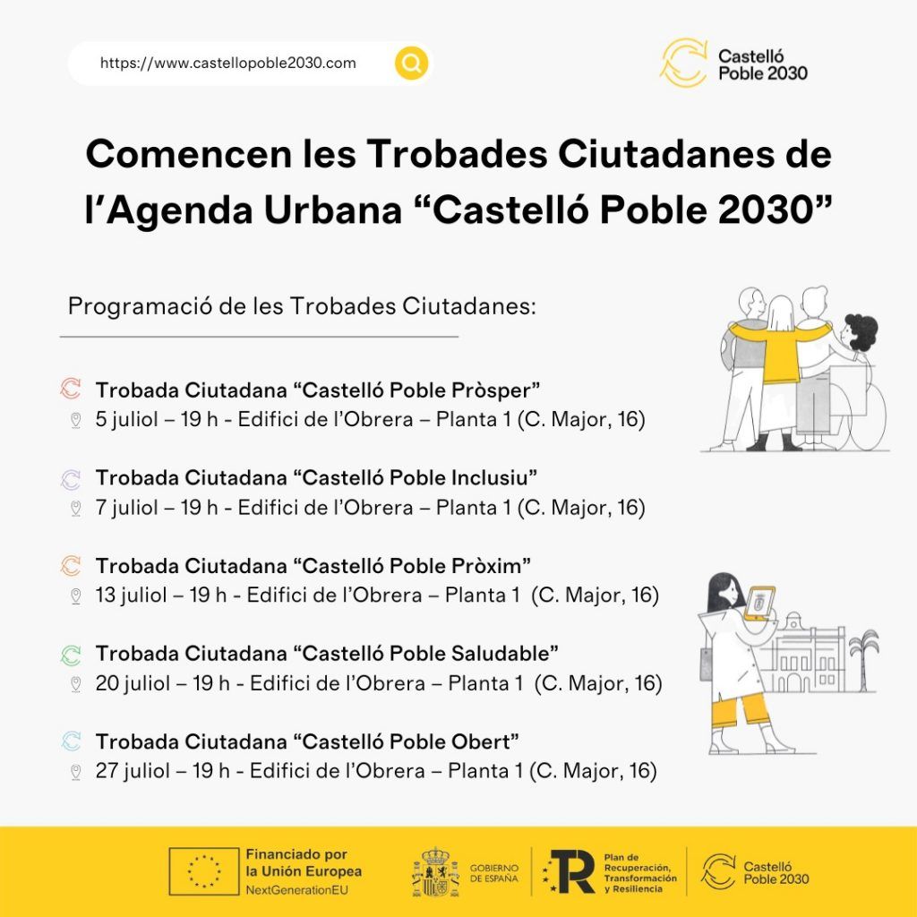 Més endavant, es facilitarà informació de cadascuna de les Trobades Ciutadanes a través de la pàgina web (https://castellopoble2030.com), El Miragall i les xarxes socials institucionals, perquè el futur de Castelló es troba a les vostres mans. Us esperem!